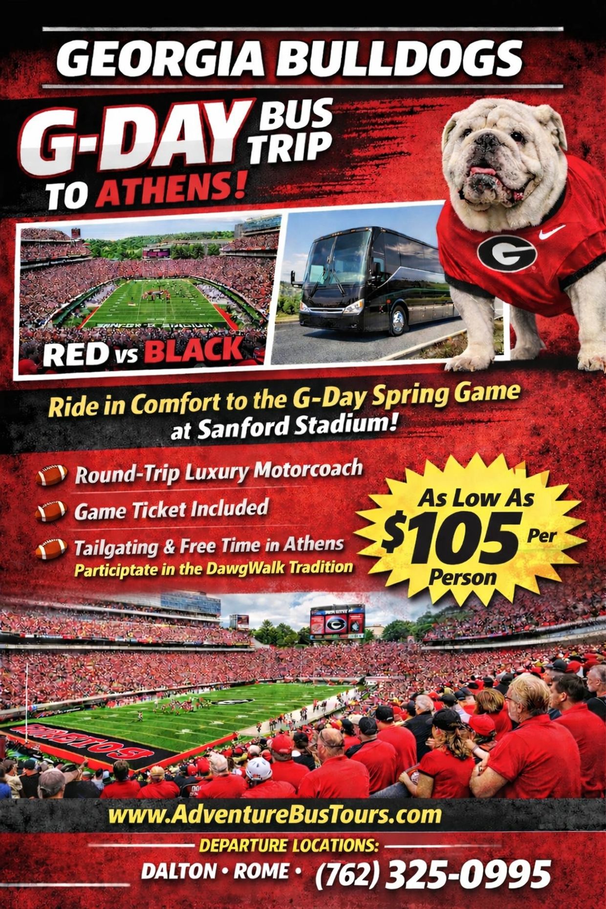 The trip is for the Georgia Bulldogs G-Day Spring Game at Sanford Stadium, home of the Georgia Bulldogs. Saturday April 18th, 2026